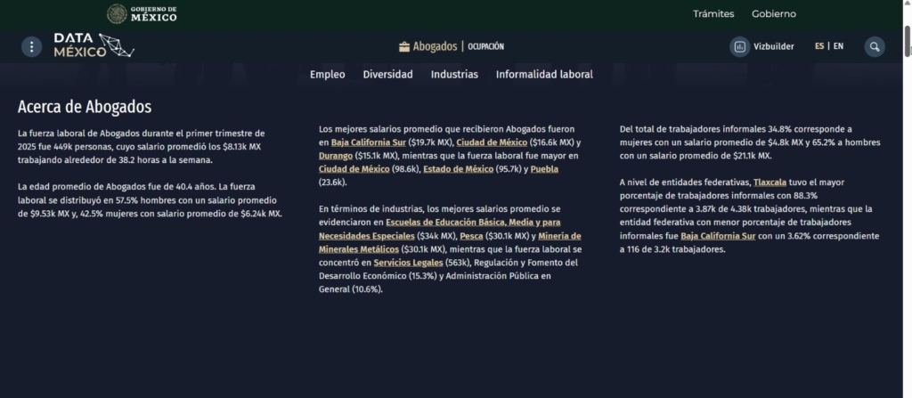 De acuerdo con datos difundidos por El Heraldo de México, con base en cifras de Data México correspondientes al primer trimestre de 2025, el salario promedio mensual de una persona abogada en el país es de $8,130.