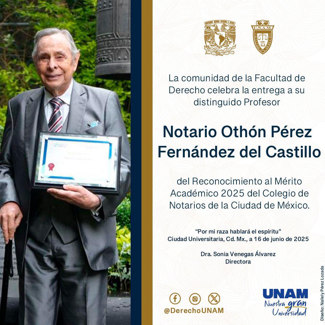 “Othón Pérez Fernández del Castillo, profesor de la Facultad de Derecho, UNAM,  fue galardonado con el Mérito Académico 2025 del Colegio de Notarios de la Ciudad de México. ¡Felicidades por este merecido reconocimiento!”.