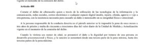 El documento explica que comererá “ciberasedio” la persona que por medio de las tecnologías de la información, las redes sociales o espacios digitales “insulte, injurie, ofenda, agravie o veje a otra persona, con la insistencia necesaria para causarle un daño o menoscabo en su integridad física o emocional”. ¿Cuál será la sanción?