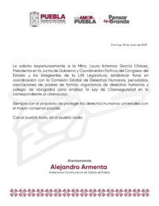 Ante esta situación, el gobernador de Puebla, Alejandro Armenta, solicitó que se realicen foros en coordinación con la Comisión Estatal de Derechos Humanos, así como con periodistas y defensores para que se analice a profundidad la Ley de Ciberseguridad.
