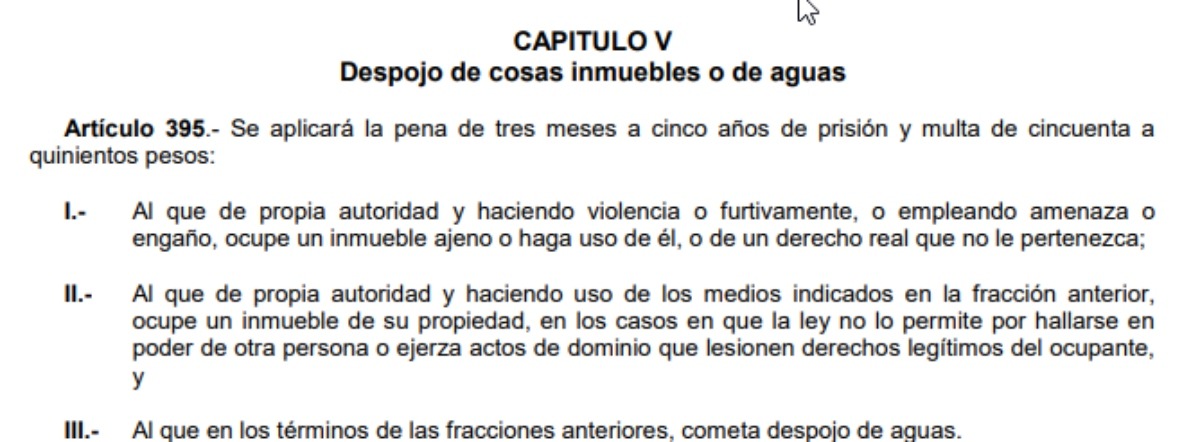 El despojo de inmuebles en México está tipificado como delito en el artículo 395 del Código Penal Federal. Sin embargo, de acuerdo con el abogado Jaime Flores, en las leyes mexicanas existen varios vacíos legales que impiden que muchas veces se llegue al final de los conflictos en materia.