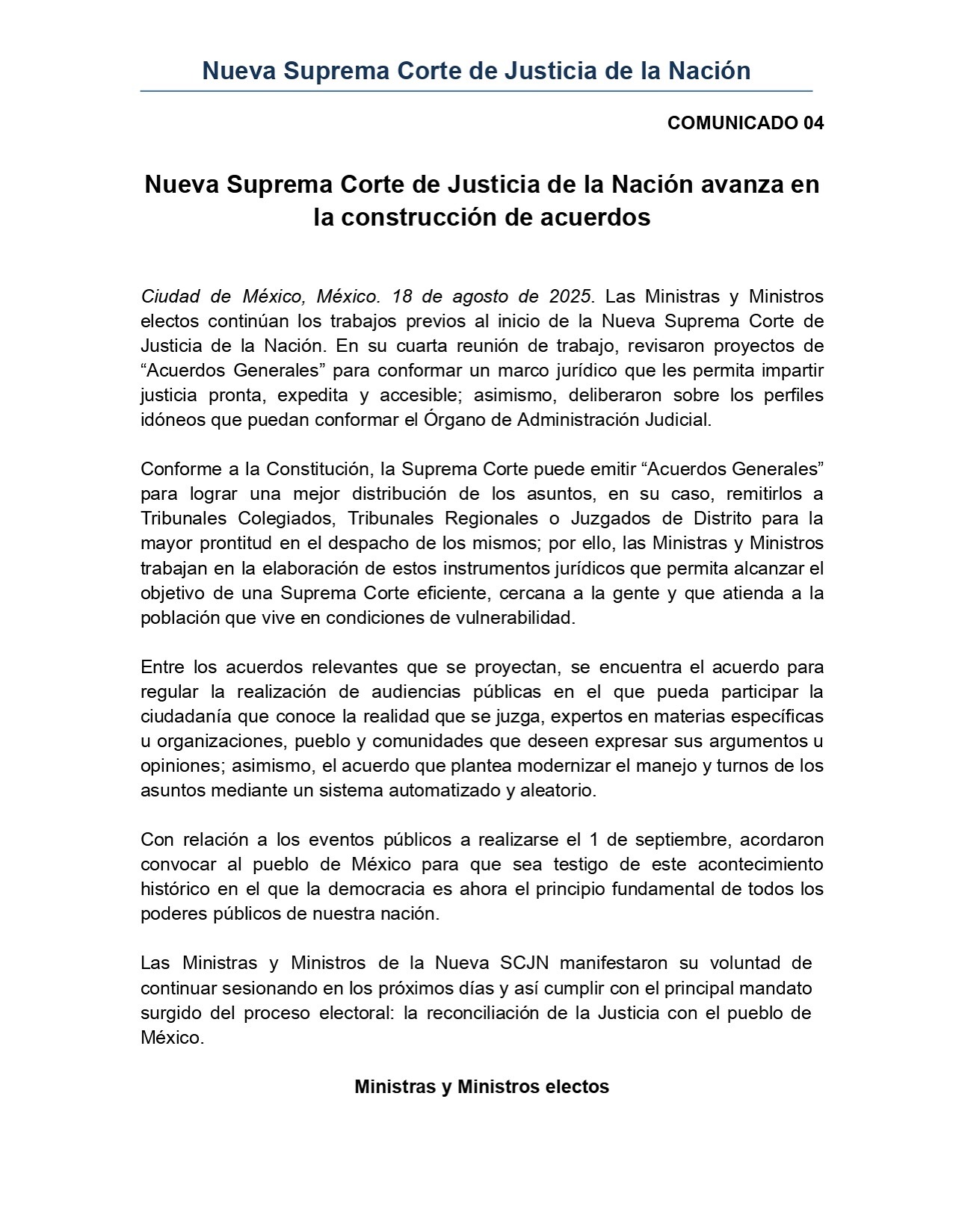 “Con relación a los eventos públicos a realizarse el 1 de septiembre, acordaron convocar al pueblo de México para que sea testigo de este acontecimiento histórico”.